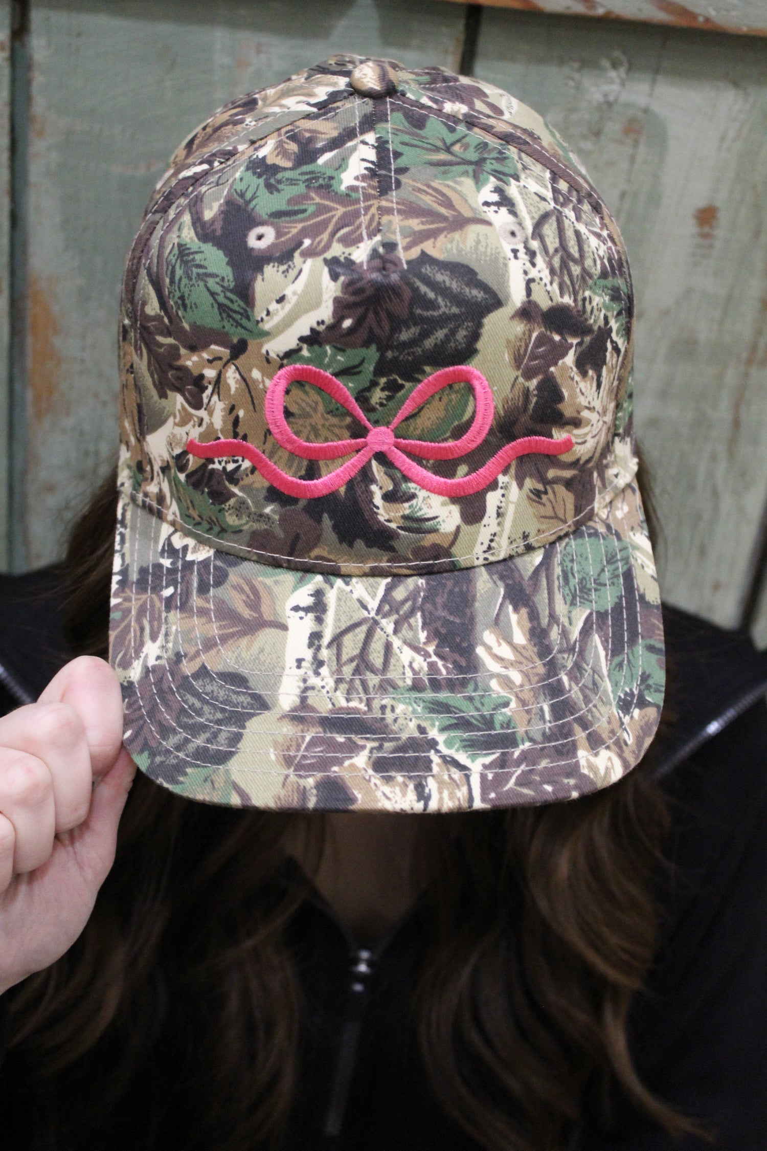 Embroidery on an Otto brand cap. This cap has a pink bow.