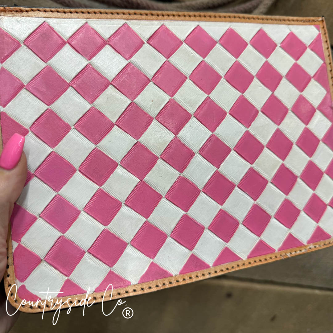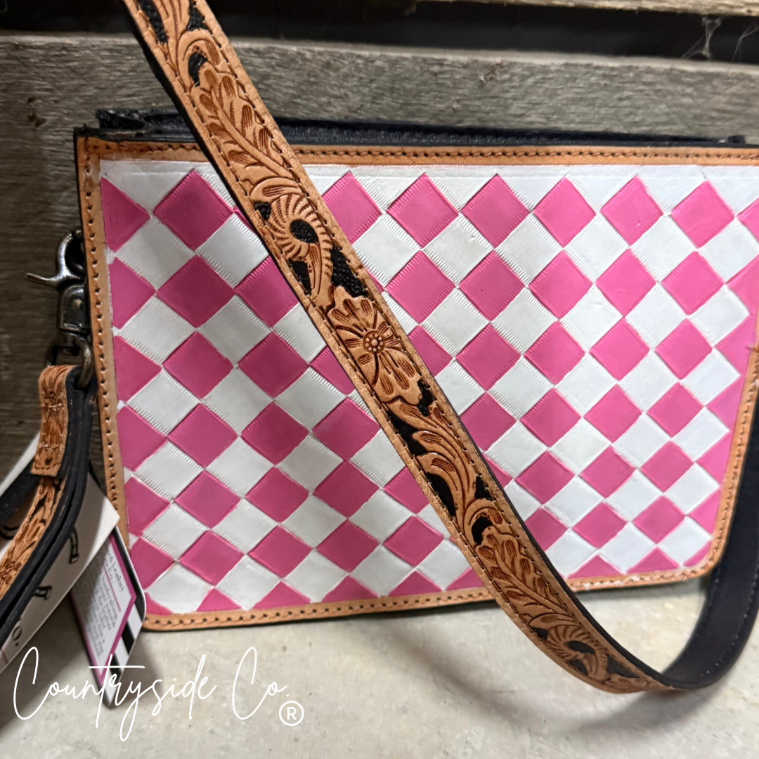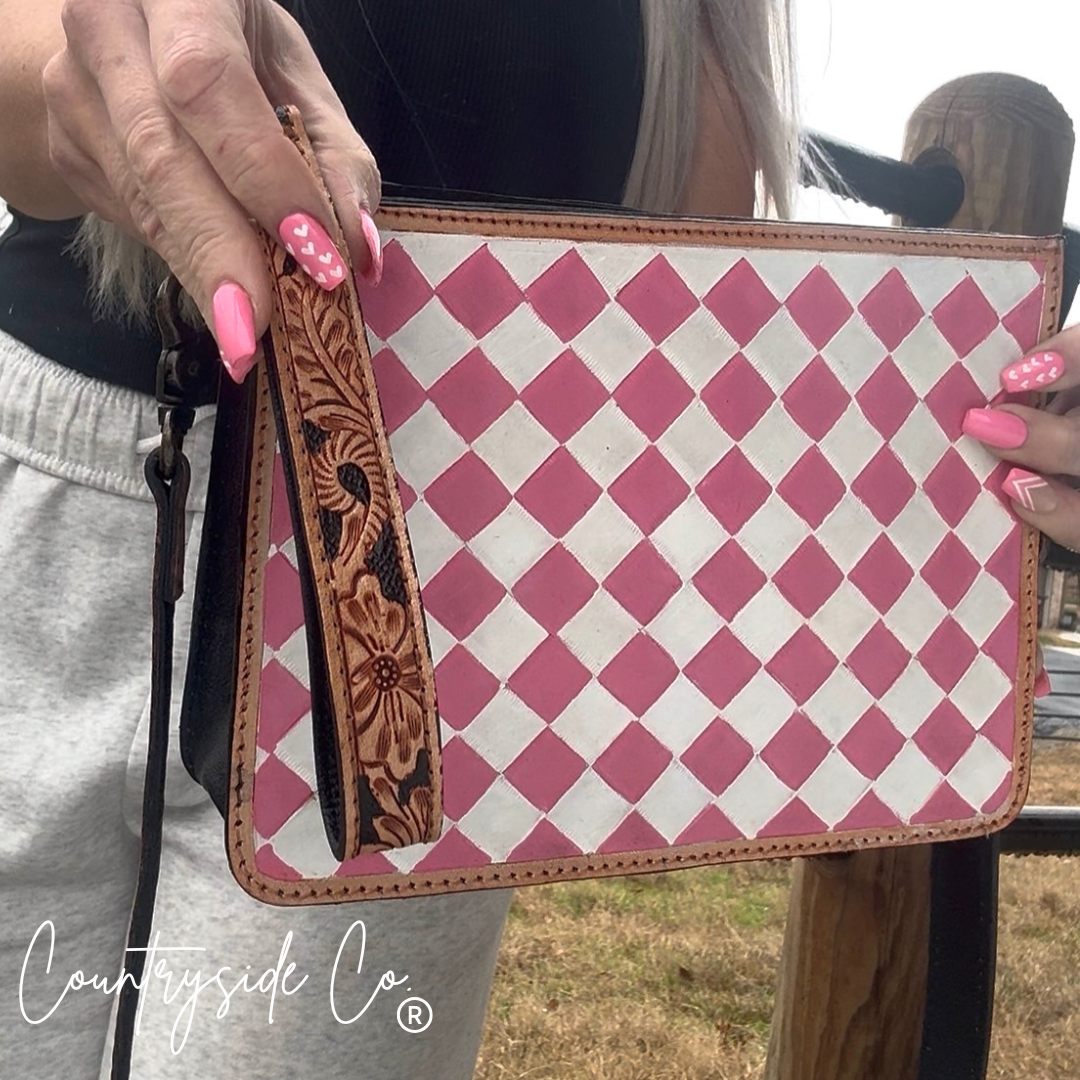 Sweet as candy and twice as charming, the Cowgirl Candy Checkered Purse brings playful flair to your everyday carry. Adorable pink and white checkered leather graces the front, while a rich leather back keeps things grounded. Swap between the detachable tooled leather shoulder strap for hands-free adventures or clip on the wristlet for quick errands. One purse, endless styling possibilities—because a true cowgirl never settles for boring.