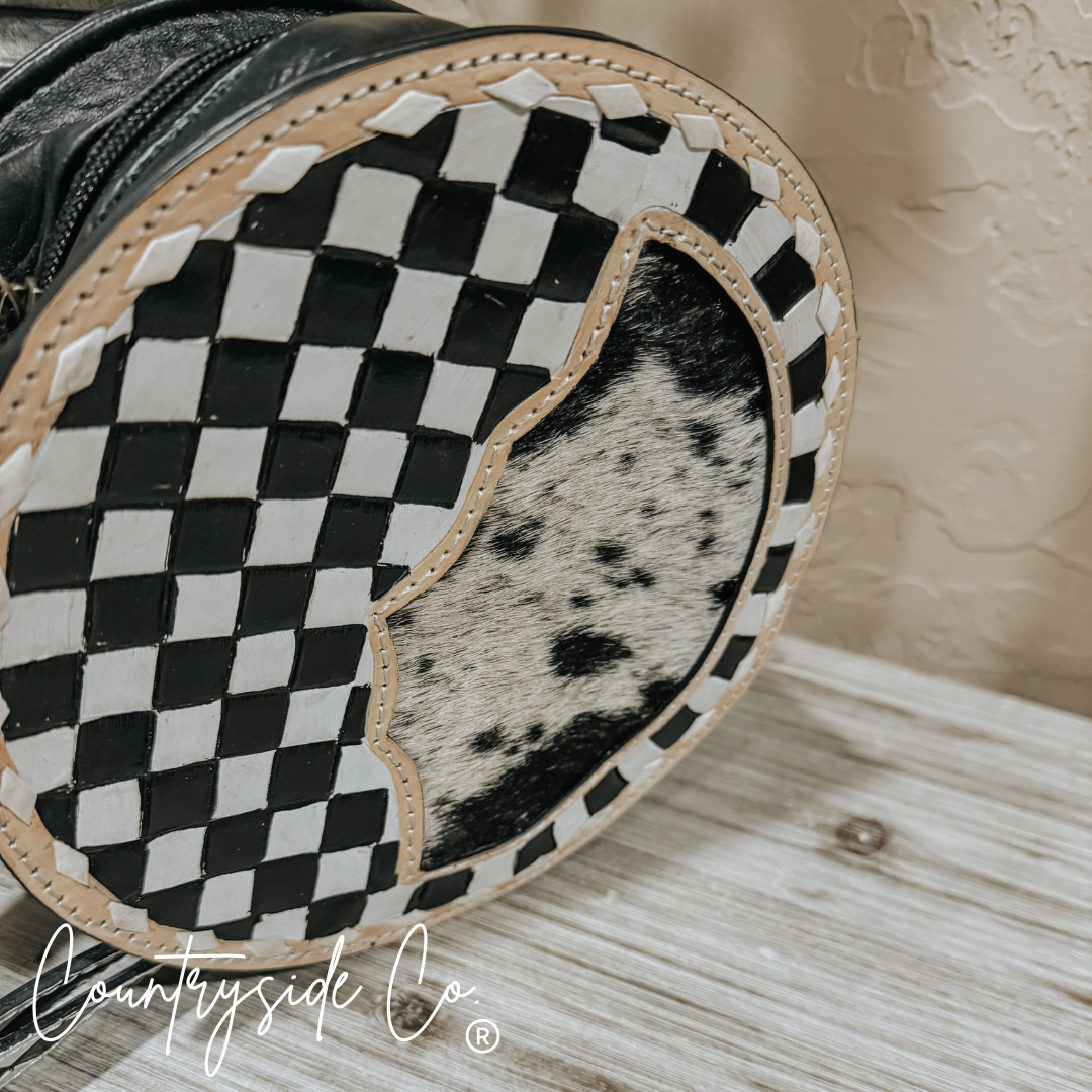 Meet the Emery Checkered & Cowhide Canteen Purse—your new partner in crime for all things fun and fabulous. Boasting a hand-painted tooled leather and cowhide front that's as unique as you are, this purse refuses to be boring. The adjustable hand-painted shoulder strap lets you wear it your way, while the interior Countryside Co. logo lining keeps things classy. Grab it and go—adventure is calling!