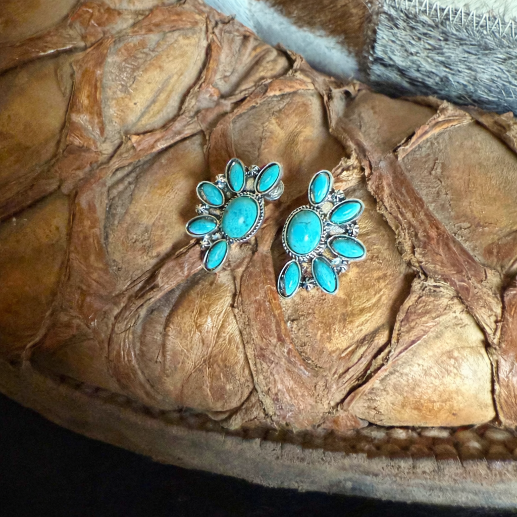 Bring a burst of fun to your style with these Flower Burst turquoise earrings featuring faux turquoise stones set in intricate detail. Their lively design adds a touch of charm and color, perfect for turning everyday moments into playful celebrations. Lightweight and eye-catching, these earrings are made to brighten up your day. Measures 1 inch.